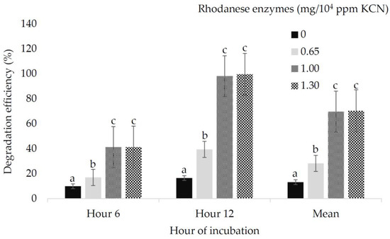 Effect of rhodanese enzyme levels on ruminal degradation efficiency of cyanide (%) at various hours of incubation [a–c Means in the same hour with different superscripts differ (p < 0.05)].