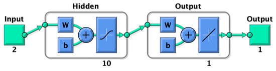 Diagram of the two-layer feedforward ANNs with a tan-sigmoid function in the hidden layer and a linear transfer function in the output layer. Ten neurons were used for amyl alcohol, ethyl acetate and n-propanol and five for isobutanol.
