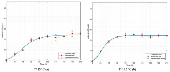 To fit the experimental data obtained, Gompertz functions (Equation (1)) were used as described by Sunita et al., Zwietering et al. and more recently by Benucci et al. [15,16,17]. In equation 1, y [mg L−1] is compound concentration, t [h] is time, a [mg L−1], b (dimensionless) and c [h−1] are mathematical parameters to describe the sigmoidal growth curve.