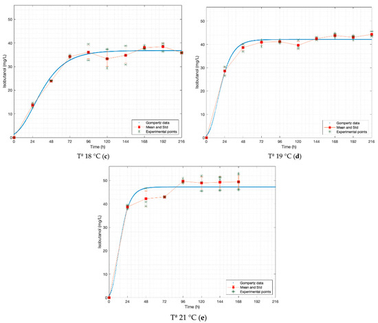 Gompertz graphs of predicted values for isobutanol. (a) Dataset 15 °C; (b) dataset 16.5 °C; (c) dataset 18 °C; (d) dataset 19 °C; (e) dataset 21 °C. Blue lines represent the Gompertz function. Asterisk for experimental raw data. Squares and red lines represent the means and standard deviations.
