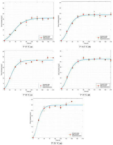 Gompertz graphs of predicted values for ethyl acetate. (a) Dataset 15 °C; (b) dataset 16.5 °C; (c) dataset 18 °C; (d) dataset 19 °C; (e) dataset 21 °C. Blue lines represent the Gompertz function. Asterisk represents experimental raw data. Squares and red lines represent the means and standard deviations.