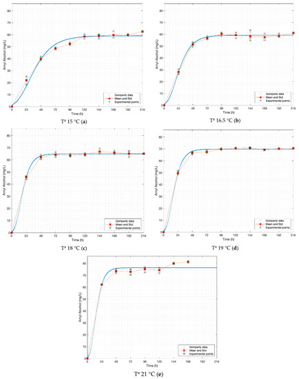The analysis of variance, for the same fermentation time and temperature, from the Gompertz equation for each case indicates that there are no significant differences between the experimental and estimated data. The statistical comparison with raw data is given in Table 3. Among F-values, the highest ones are those from 21 °C (its p-values are the lowest). Due to this higher temperature, the experimental data corresponding to the first 24 h of fermentation is close to the value of the asymptote A.