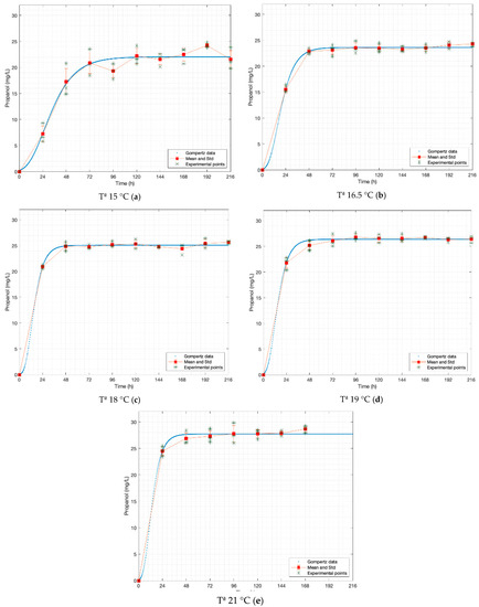 Gompertz graphs of predicted values for propanol. (a) Dataset 15 °C; (b) dataset 16.5 °C; (c) dataset 18 °C; (d) dataset 19 °C; (e) dataset 21 °C. Blue lines represent the Gompertz function. Asterisk represents experimental raw data. Squares and red lines represent the means and standard deviations.