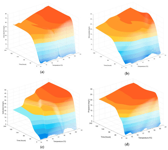 Amyl alcohol, ethyl acetate and n-propanol ANNs were generated with ten neurons in the hidden layer, isobutanol with five neurons. The results have been represented in Figure 6, where isobutanol is the compound on which the temperature exerts the greatest influence, n-propanol and amyl alcohol are the fastest to reach high values with mean kg values of 1.142 and 2.324 [mg L−1 h−1] respectively.