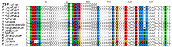 All sequences were aligned using the MUSCLE algorithm [18], and the generated data were visually inspected for variable sites within the homologous region (Figure 1). The most variable region in P. roqueforti with a significantly different sequence, compared to other Penicillia, in the alignment was selected as a template for the ITS-Pr primer specific to P. roqueforti. Using the OligoAnalyzer Tool (https://www.idtdna.com/ (accessed on 7 October 2021)), the preferred oligonucleotide was next analysed for potential hairpin loops as well as self- and hetero-dimers, with ITS4 as the intended reverse primer.