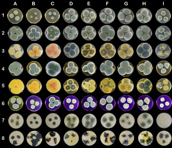 On CREA medium, clone CCDM 194d produced small velutinous colonies with irregular wrinkles and fasciculate in the centre (Table A4; Figure 2 (6I)). The remaining strains and clones of P. roqueforti generated velutinous colonies with radially aligned wrinkles. A different colony pattern was also noted on the CREA medium. Furthermore, discolouration of the CREA medium inoculated with P. crustosum and P. carneum was noted.