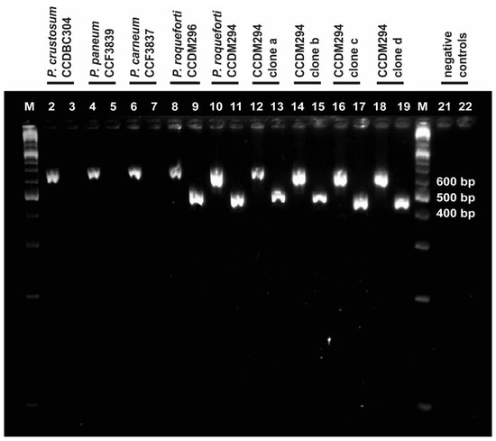 Specificity of the ITS-Pr primer was tested via PCR using ITS4 as the reverse primer. PCR was carried out using 1 ng of DNA from each P. roqueforti strain or clone (CCDM 294, 294-a, 294-b, 294-c, 294-d, and CCDM 296), P. carneum (CCF 3837), P. paneum (CCDBC 3839), and P. crustosum (CCDBC 304). P. carneum and P. paneum were deliberately selected as the closest species related sequentially and morphologically to P. roqueforti. P. crustosum was chosen as the common contaminant. PCR was performed in a 25 µL reaction volume (0.5 µL of each primer (200 nM), 1 µL of DNA template (100 ng), 12.5 µL of 2× PPP Taq MasterMix (TopBio, Czech Republic), and 10.5 µL of ddH2O). The amplification conditions were as follows: pre-heating at 95 °C for 2 min, 35 cycles of denaturation at 95 °C for 30 s, annealing at 52 °C for 30 s, and extension at 72 °C for 60 s, followed by a final extension at 72 °C for 8 min. PCR products were separated and visualised according to the method described in Section 2.2.2.
