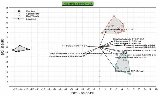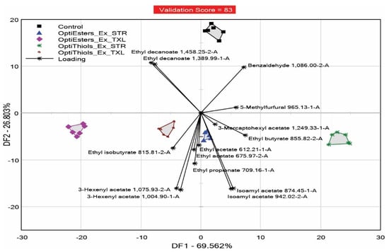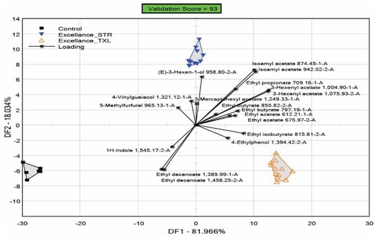 To confirm that the electronic nose can clearly separate the volatile profiles of the wines produced with different yeasts, a DFA analysis (Figure 2) was performed only for three groups: Control (indigenous yeasts), the STR group (including wine variants Ester-STR and Thiol-STR) and the TXL group (including wine variants Ester-TXL and Thiol-TXL). This time, the validation score was sufficiently high to account for a good separation of the samples in the DFA diagram. It can be observed that the presence of relatively high contents of ethyl decanoate and indole, coupled with the relative scarcity of 3-hexenyl acetate and isoamyl acetate, are most discriminating for the Control wine group, while more complex combinations of volatile compounds are responsible for the discrimination of the STR and TXL groups.