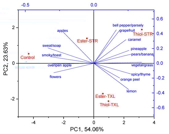 Principal component analysis (PCA) showing the main aromas perceived during sensory analysis, including the components which explain the variability of the wines obtained with combinations of two different yeasts (TXL and STR) and two different added nutrients (Ester and Thiol).