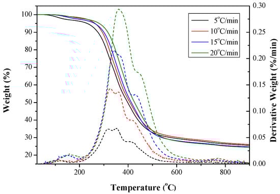 The thermogravimetric analysis (TGA) and derivative thermogravimetry (DTG) curves of the dried SP (about 0.2 g) were obtained at four different heating rates (i.e., 5, 10, 15 and 20 °C/min) under the nitrogen flow (50 cm3/min), as depicted in Figure 1. Obviously, these curves revealed similar thermal behaviors according to the residual weight percentages as a function of temperature. Using the TGA curve at 10 °C/min as an example, the initial weight decline occurred in the range from 100 to 200 °C, which should be attributed to the losses of attached matters (e.g., moisture) and light volatiles due to the incipient decompositions of liable organic matters. Subsequently, significant mass loss was observed at the temperature range of 200 to 400 °C, which corresponded well to the decompositions of organic constituents such as hemicellulose and cellulose []. When the temperature was raised to above 400 ℃, the continued mass loss was caused by the volatilization of complex lignocellulosic fractions (e.g., lignin) and inorganic carbonates/oxides. These data were consistent with those in the literature []. From the TGA curves (Figure 1), it was suggested that the dried SP could be an excellent precursor for producing biochar at higher carbonization temperatures. In this regard, this work adopted carbonization conditions in the range from 400 to 800 °C at the heating rate of 10 °C/min for producing biochar products with high pore properties.