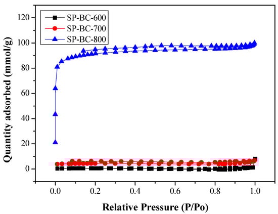 N2 adsorption-desorption isotherms of SP-BC products prepared at different carbonization temperatures.