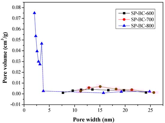 Figure 2 showed the N2 adsorption/desorption isotherms of all resulting SP-BC products at −196 °C. Herein, the isotherms of the SP-BC-400 and SP-BC-500 products were not depicted in Figure 2 because of their relatively low adsorption/desorption amounts. From the isotherm shape, the SP-BC-800 product obviously exhibited the characteristics of Type I. Based on the definition by the International Union of Pure and Applied Chemistry (IUPAC) [], carbon material with the Type I isotherm could be highly microporous because it has a high potential for adsorption at very low relative pressure (P/P0) (˂0.1) by micropore filling. However, typical microporous materials often contain pores over a wide range of sizes, including micropores (˂2 nm) and mesopores (2–50 nm). When the values of P/P0 increased from 0.1 to 1.0, the curves in Figure 2 indicated a low slope of the plateau, which was attributed to the multilayer adsorption on the pore surface of the resulting biochar products. Based on the capillary condensation of N2 at a relative pressure of about 1.0, all pores were thus filled by liquid N2, suggesting that total pore volume can be estimated by converting the saturated adsorption amount into liquid N2 volume using its liquid density (i.e., 0.808 g/cm3). It was also seen that the resulting SP-BC-800 product also exhibited a hysteresis loop with the Type IV isotherms [], which showed the existence of a micro-mesoporous composite structure from the Type I and Type IV isotherms. Furthermore, this can be observed in its pore size distribution (Figure 3), which can be consistently linked to its pore properties, as listed in Table 3.