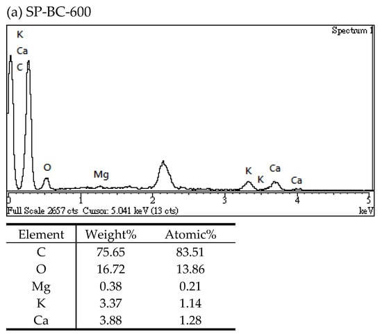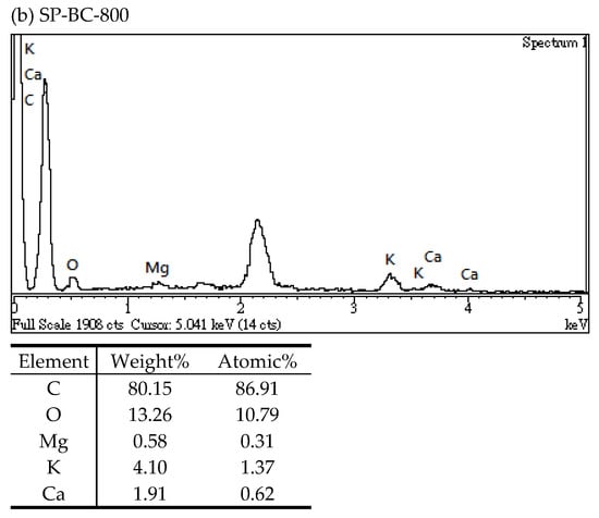 In this work, the changes in the elemental distributions on the surface of the biochar products were analyzed by energy dispersive X-ray spectroscopy (EDS). Figure 4 illustrated the EDS spectra of the resulting biochar products (i.e., SP-BC-600 and SP-BC-800) prepared at different temperatures (i.e., 600 and 800 °C). It clearly showed that the main elements on the surface of the biochar products included carbon and oxygen. In addition, the carbon contents of the biochar products slightly increased from 76.7 wt% to 80.2 wt% as the temperature increased from 600 °C to 800 °C. The high content of oxygen in the biochar should be indicative of the functional oxygen-containing groups on the surface such as carbonyl (C=O-). Furthermore, the presence of magnesium (Mg), potassium (K) and calcium (Ca) was observed in the biochar products, which could be associated with the forms of carbonates or oxides. It can be seen that the metal elements in the biochar products should be derived from the precursor SP, as listed in Table 2.