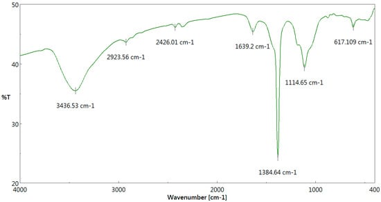 The Fourier-transform infrared spectroscopy (FTIR) spectra of the biochar product with the highest pore properties (i.e., SP-BC-800) was recorded in the range of 400–4000 cm−1, as shown in Figure 5. Clearly, there were four significant absorption peaks at about 3440, 1640, 1385 and 1115 cm−1, which could be associated with functional oxygen-containing groups [,]. For example, the absorption peak at 3450 cm−1 in the biochar product could be assigned to the stretching vibration of hydroxyl group (O-H). In addition, the sharp peaks at about 1640, 1385 and 1115 cm−1 may be attributed to the carbonyl (C=O-), O-H bending (phenolic) and symmetric C-O stretching, respectively []. From the findings of the EDS (Figure 4) and the FTIR (Figure 5), the SP-BS-800 biochar product may be hydrophilic because its surface is rich in oxygen.