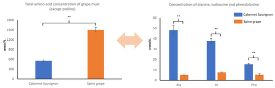 Concentrations of total amino acid (except proline), alanine, isoleucine, and phenylalanine in Cabernet Sauvignon and spine grape must. Difference significant at 99% (**) confidence level.