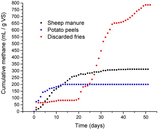Batch digestion tests were performed for the individual substrates. Digestion of the materials proceeded at rates that were in line with their characteristic composition. Thus, sheep manure presented behavior that can be categorized as linear in its initial stage, which is indicative of hydrolysis limitations (see Figure 2). The first-order model for describing hydrolysis performance applies when the surface of the particulate substrate is the rate-limiting factor [], and no other phenomena are implicit in the degradation process. Similarly, the performance of potato peels can be assumed to follow the same type of kinetics. Thus, the steep increase observed in the cumulative gas curve gives an indication of the ease of degradation. In a study by Achinas et al. [], the result of the digestion of potato peels was 217.8 mL CH4/g VSadded. This value is just slightly higher than that obtained here (200 mL CH4/g VSadded), but denotes consistency in results.