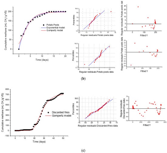 Results obtained from adjusting exponential and modified Gompertz models to cumulative curves for methane. Data obtained from batch digestion of samples of (a) sheep manure, (b) potato peels, and (c) discarded chips.
