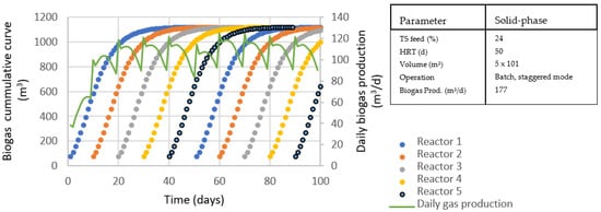 The average production of biogas, in this case, will be affected by the different stages, in which each reactor is operative. Figure 8 presents the expected evolution of gas, considering that no additional methane will be produced from wood chips if they are used as a structuring agent, and also assuming a decrease of 20% in the global biogas yield, compared to that obtained from BMP tests, to take into account the effect of working under solid-phase conditions. The daily methane production was then estimated to be 106.6 ± 9.6 m3/d (equivalent to daily production of 177 ± 16 m3/d). Under the considered assumptions, this value is higher than that obtained under wet configuration. However, as a disadvantage, the solid-phase reactor has a longer retention time, and the batch operation mode makes the system require more labor (due to loading and unloading operations). If working under solid-phase configuration causes a greater decrease in microbial performance than that initially assumed, to the disadvantage of higher volume and labor demand, an even lower methane production may be added. This negative effect was reported by Jansson et al. [] when evaluating high solid content digestion, indicating a decrease in methane production of 78–123% by further increasing solid content from 14% TS to 16 and 20% TS.
