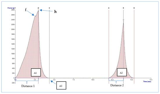 Representative plot of TPA of Itrana cv. olive. A1, Area 1; A2, Area 2; A3, Area 3; f, fracturability; h, hardness.