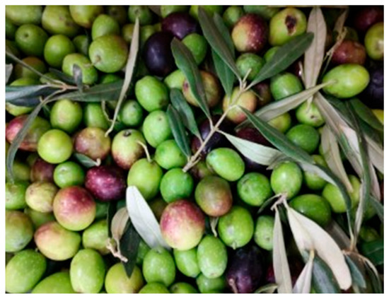 Figure 2 shows a portion of the olives used for the experiments (Itrana cv.). The first assay to be done on the fresh product was the determination of the Jaen Maturity Index. According to paragraph 2.2.1, the JMI calculated (1.04) confirms that the assessed sample is between “Category 1” (Skin color yellow-green) and “Category 2” (skin color green with reddish spots on <half the fruit surface. Start of color change).