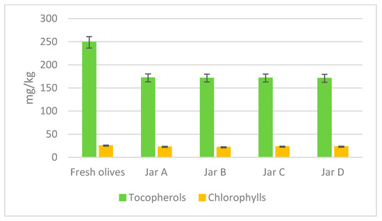 Figure 4 shows the content of tocopherols and chlorophylls in the oil extracted both from the fresh Itrana cultivar olives and from the processed olives. Tocopherols are important in daily nutrition and disease prevention and their content is mainly influenced by the variety but also by other factors [21,22]. The total tocopherols content in fresh Itrana cultivar olives was 248.7 mg/kg, while it decreased after fermentation in all jars at a rate of about 30% less: jar A 171.8, jar B 171.3, jar C 171.5, and jar D 170.8 mg/kg. The chlorophyll content of fresh olives was found to be 25.20 mg/kg. After the fermentation process, there was a degradation of the chlorophyll in all jars. However, no significant differences were found between spontaneous fermentation (jar A) with 22.60 mg/kg and fermentation with single, multiple inocula, and mixed of bacterium and yeast (jar B, jar C, and jar D) with values of 21.70, 22.97, and 22.96 mg/kg, respectively.