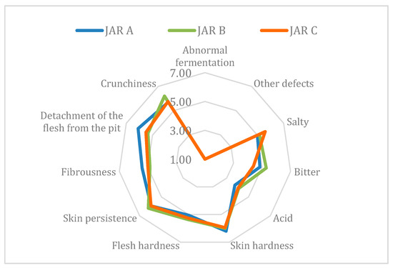 The samples were characterized by low residual bitterness, good texture, and satisfying acid taste. Jar A (without inoculum) and jar B (with only one L. plantarum) were more bitter and fibrous than jar C (with three strains of L. plantarum) at the end of fermentation. In jar A, the olives were less acid than those in the other two jars, probably due to the absence of Lactobacillus strains which produce an acid environment in the brine. From a kinesthetic point of view, jar B and jar C seem to be very close to each other, except for the crunchiness parameter: the olives in jar B were the crunchiest (6.20 median value).