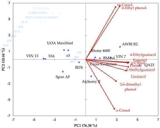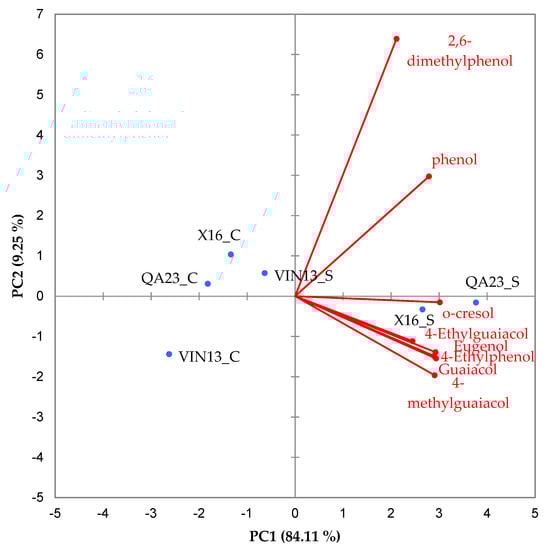 Figure 3. The PCA biplot explains 93.36% (PC1 = 84.11% and PC2 = 9.25%) of the variance in the data set. Except for smoked wines fermented with VIN 13, there was a clear separation of smoked and unsmoked wines. The wines produced from smoked juice contained significantly higher levels of volatile phenols than the control wines (
