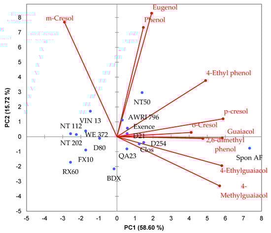 Figure 2. The PCA biplot explains 74.32% (PC1 = 58.60% and PC2 = 15.72%) of the variance in the data set. As observed with the Chenin Blanc wines, the volatile phenol levels varied in the Merlot wines produced with the different yeast strains. Wines that underwent spontaneous alcoholic fermentation showed a positive association with guaiacol (8.21 µg/L), 4-methylguaiacol (4.56 µg/L), 4-ethylguaiacol (2.35 µg/L), 4-ethylphenol (0.77 µg/L), 2,6-dimethyl phenol (1.81 µg/L),