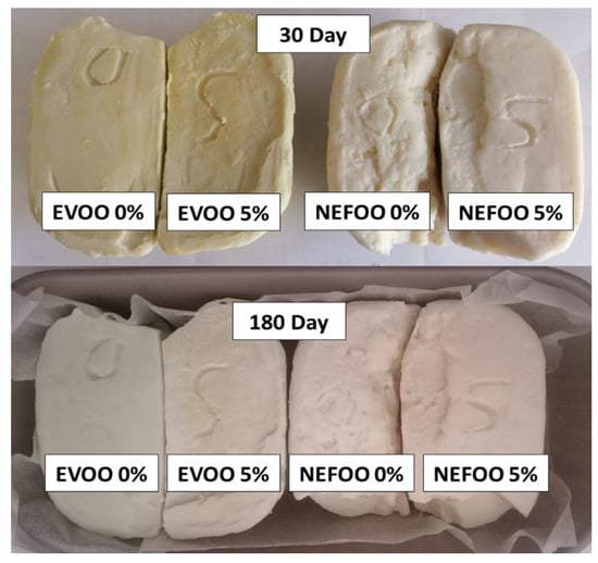 | Days of Maturation | EVOO Soap 0% | EVOO Soap 5% | NEFOO Soap 0% | NEFOO Soap 5% | ||||||||||||