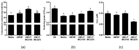 (a) Total phenol content (TPC) (b) reducing power, and (c) total H2O2 content of AM-NF, AM-LP MG5145, and MG5276. Values are expressed as means ± SD (n = 3). Means with different letters within a column are significantly different at p < 0.05 using Tukey’s multiple comparison test. Media: media without A. membranaceus extract, AA: ascorbic acid, AM-NF: A. membranaceus extract not fermented by L. plantarum, AM-LP: A. membranaceus extract fermented by L. plantarum.