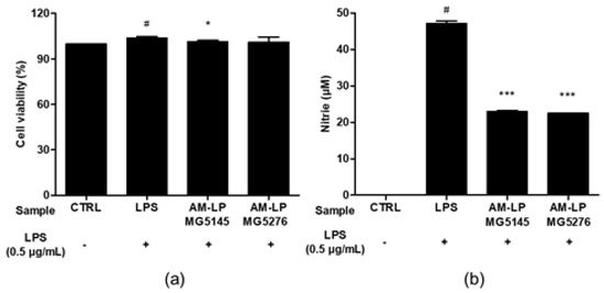 Effect of AM-LP MG5145 and AM-LP MG5276 on (a) Cell viability and (b) NO production in LPS-induced RAW 264.7 cells. Cells were treated with 20% (v/v) samples and LPS (0.5 μg/mL) for 24 h. Data are represented as the mean ± SD (n = 3). # p < 0.05 compared to untreated LPS control. * p < 0.05 and *** p < 0.001 compared to treated LPS control.