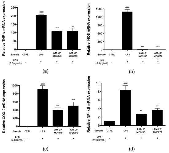In conclusion, AM-LP MG5145 and AM-LP MG5276 significantly reduced the expression levels of TNF-α, iNOS, COX-2, and NF-κB in LPS-induced RAW 264.7 cells.