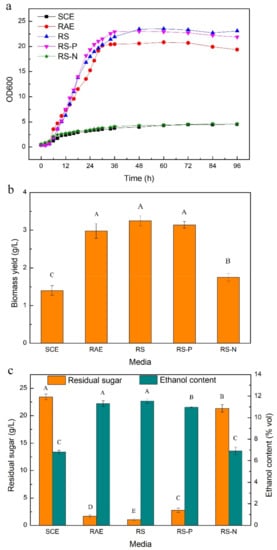 The growth and fermentation properties of S. cerevisiae D254 in different substrates. (a) The growth of D254 was monitored using OD600 and (b) the biomass yield was calculated using cell dry weight per liter medium. (c) The residual sugar of fermentation end point was tested. SCE medium: Spent coffee ground (SCG) extracts mixed with 20% sucrose and pH was adjusted to 4.0 by HCl. RAE medium: 20% sucrose, 1% yeast extract, 1% peptone, 0.3381% Na2HPO4·12H2O, and 0.151% citric acid mixed and pH was adjusted to 4.0 by HCl. RS medium: water in the RAE medium was replaced by SCG extract and other compositions remained unchanged. RS-P medium: Na2HPO4·12H2O was removed from the RS medium. RS-N medium: yeast extract and peptone were removed from the RS medium. Values with different capital letters in the columns of the same color are significantly different (p < 0.05).