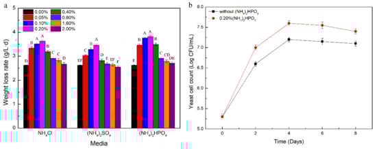 Considering the high quality, high efficiency, low price, and easy availability of inorganic ammonium salts, different concentrations of NH4Cl, (NH4)2SO4, and (NH4)2HPO4 were used to try to improve alcohol fermentation []. As shown in Figure 2a, the addition of the three nitrogen sources performed different effects on the metabolism of S. cerevisiae D254. Overall, the growth and fermentation capacities enhanced first and then decreased with the increasing concentration of nitrogen sources. The highest biomass yield and ethanol content and the lowest residual sugar were observed at the addition of 0.20% of each nitrogen source, and the biomass yield and ethanol content in the addition of (NH4)2HPO4 were higher than those seen with the addition of NH4Cl and (NH4)2SO4 at the same concentration (Figure S2, []).