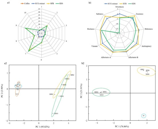The analysis of the (a) electronic nose and (b) electronic tongue. (a1): Radar graph of samples’ aroma, (b1): Radar graph of samples’ taste. (a2,b2): PCA of samples. C: Coffee. S: SCG extract. SFB: SCG fermented beverages. SDS: SCG distilled spirits.