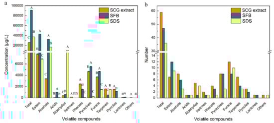 Variation in (a) concentration and (b) number of volatile compounds in samples. SFB: SCG fermented beverages. SDS: SCG distilled spirits. Values with different capital letters upon the columns of the same item are significantly different (p < 0.05).