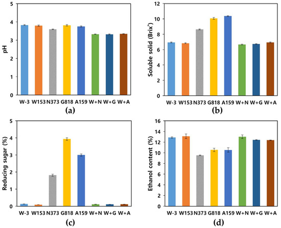 Characteristics of yakju after fermentation: (a) pH; (b) Soluble solid (Brix°); (c) Reducing sugar (%); (d) Ethanol content (%). W + N, co-culture of W153 + N373; W + A, co-culture of W153 + A159; W + G, co-culture of W153 + G818.