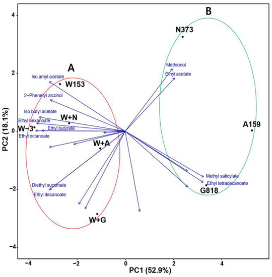 Figure 2 shows the biplot results for the volatile fragrance components. Based on PC1, it could be divided into two groups: non-Saccharomyces single culture (B) and S. cerevisiae single/co-culture samples (A). Moreover, it was confirmed that PC2 showed similar values depending on the non-Saccharomyces strain involved in fermentation. In the case of P. kudriavzevii N373, a significant difference was observed between the single culture and co-culture (W + N, N373), but the single fermentation of A159 and G818 strains showed similar PC2 values to those of co-culture (W + A and W + G, respectively). Results of the loading plot (blue arrow) indicate that most aromatic compounds were contained in group A (13/20), and the aromatic compounds were strengthened through co-culture. Methionol, ethyl acetate, methyl salicylate, and ethyl tetradecanoate were specifically produced in large amounts in the single-culture non-Saccharomyces group.