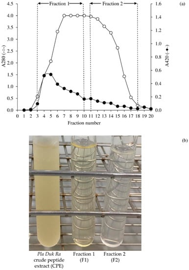- Choksawangkarn, W.; Phiphattananukoon, S.; Jaresitthikunchai, J.; Roytrakul, S. Antioxidative peptides from fish sauce by-product: Isolation and characterization. Agric. Nat. Resour. 2018, 52, 460–466. [Google Scholar] [CrossRef]