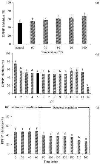 3.7. Effects of Heating Temperature, pH, and In Vitro Digestion on DPPH● Scavenging Activity of Selected Peptide Fraction