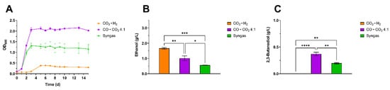 3.2. Screening of Gaseous Substrates for Enhanced 2,3-BDO Production Using Clostridium ljungdhalii and Clostridium autoethanogenum