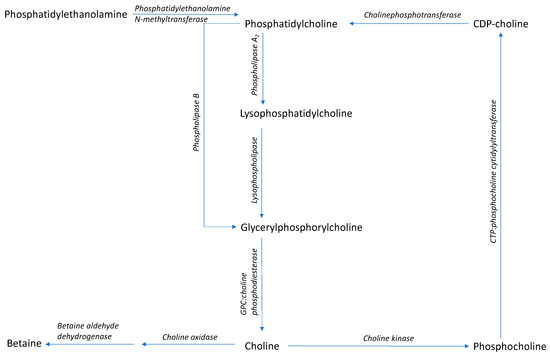 Synthesis and metabolism pathway of α-glycerylphosphorylcholine (Adapted from Li and Vance 2008 [70]; Gallazzini and Burg 2009 [71]). The blue area represents processes of the Kennedy Pathway, and the green area represents the synthesis of phosphatidycholine via methylation of phosphatidylethanolamine.