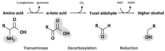 Ehrlich pathway conversion of amino acids into fusel alcohols.