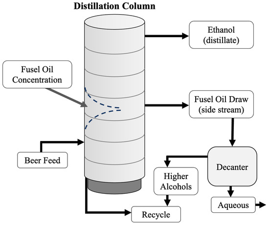 During ethanol distillation, fusel alcohols concentrate in the distillation column as they are less volatile than the ethanol water azeotrope. The removal of these compounds is not required for fuel production but is essential for ethanol destined for food or pharmaceutical applications. If these higher alcohols are not removed, they can reach their limit of solubility and increase vapour pressures in the column. In turn, the increase in vapour pressure can cause boiling and flooding and thus interfere with distillation. In bioethanol plants with continuous distillation processes, the fusel alcohols are distributed in the distillation or rectifier column, where the product at the top of the column is purified alcohol (~95% by wt.), and at the bottom is mostly water. Fusel alcohols are most volatile at lower ethanol concentrations and tend to collect in the intermediate region where ethanol concentration is approximately 45% (v/v) [76]. In continuous distillation columns, fusel alcohol removal is accomplished by drawing a solution of water, ethanol, and fusel alcohols from the center of the rectifier (Figure 4).
