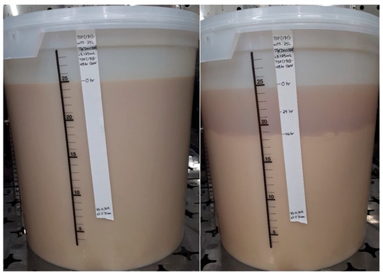 Wheat thin stillage before (left) and after (right) 48 h of secondary fermentation by lactic acid bacteria. The initially homogenous solution separates into an upper layer composed of, mostly, clear liquid and a protein rich slurry in the bottom layer.