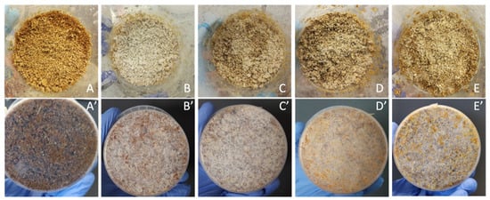 Growth of CpC7 strain under SSF using organic wheat bran as solid substrate, at (B) 6, (C) 9, (D) 12 and (E) 15 days of fermentation. The top (A–E) and bottom (A’–E’) surfaces of the OWA colonized substrates are shown. (A,A’), not inoculated substrate.