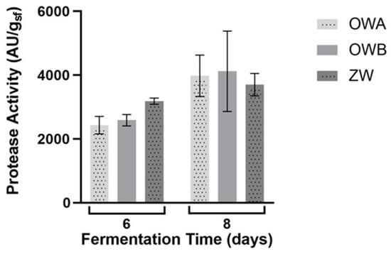Effect of different wheat bran substrates (OWA, OWB and ZW) on protease production by CpC7 strains under SSF conditions, after eight days of fermentation. Data represent the average ± standard deviation of biological replicate cultures (n = 3).