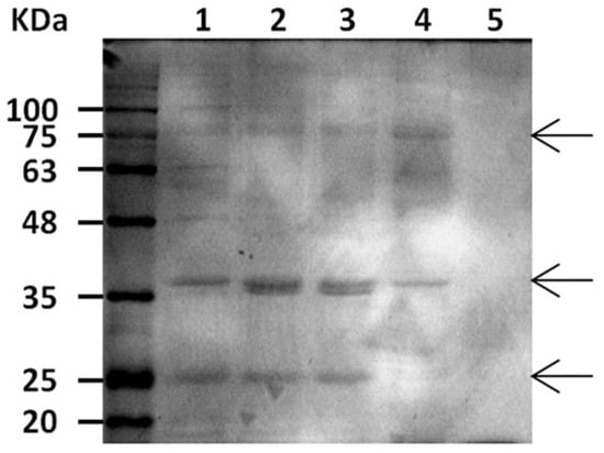 SDS-PAGE separation of enzyme crude extract produced at 4 (lane 1), 6 (lane 2), 8 (line 3), and 12 (line 4) SSF days by CpC7 on ZW; negative control (line 5). Arrows point to three main bands, respectively at 77, 37 and 27 KDa, putatively corresponding to extracellular laccase, endothiapepsin, and to an uncharacterized peptide.