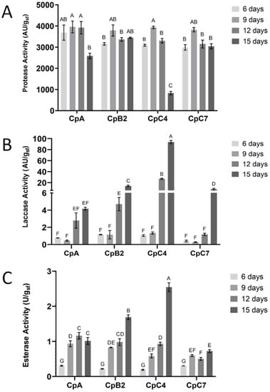 Time courses of protease (A), laccase (B) and esterase activities (C) produced by four C. parasitica environmental strains (CpA, CpB2, CpC4, CpC7), grown on ZW for 15 days. Different letters indicate significant differences (p < 0.05); means sharing a letter are not significantly different (p > 0.05). Data represent the average ± standard deviation of biological replicate cultures (n = 3).