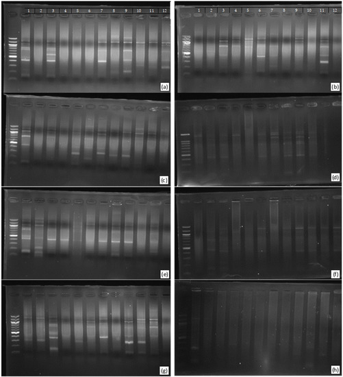 Interdelta electrophoretic patterns of 96 different Saccharomyces cerevisiae strains taken from Château Kefraya. The figure is divided into 8 pictures (a–h) each one contains 12 lanes representing the different yeast strains.